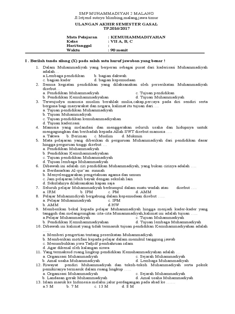 Contoh soal uts kemuhammadiyahan sd muhammadiyah k. Soal pas uas kmd kelas 11 sma smk semester 2 ruang siswa from www.ruangsiswa.id. Soal ujian sekolah kemuhammadiyahan smk. Suatu interaksi antara 2 orang atau lebih, dalam bentuk pengetahuan, musyawarah, atau pun ilmu tertentu yang bertujuan untuk memberikan pemahaman yang benar disebut …. Tulis namamu di sudut kanan atas.