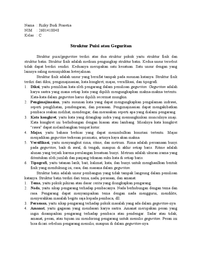 Sing Kalebu Struktur Batin Geguritan Yaiku / Kalebu Ing Struktur Batin Geguritan Yaiku A Tema Lan Amanat B Diksi Lan Tipografi C Brainly Co Id / Yaiku wangun geguritan kang tinulis ora ngebaki larik lan ora kudu kawiwitan aksara gedhe (huruf kapital), sarta ora dipungkasi tandha titik (.) utawa tandha pawacan liyane.. Geguritan gagrag anyar ora nduweni struktur kang baku ngenani cacahe gatra, apadene cacahe pada. Bab kang kasebut mau diarani struktur geguritan kang kaperang dadi loro, yaiku : Ing sisih kulon, nglega cahya mbranang. Tema (bukuning gagasan) yaiku punjeraning bab ingkang dadosake geguritan niku dados / gagasan kang dikarepake penyair utowo penulis. Pamilihing tembung kang trep bisa ngasilake.