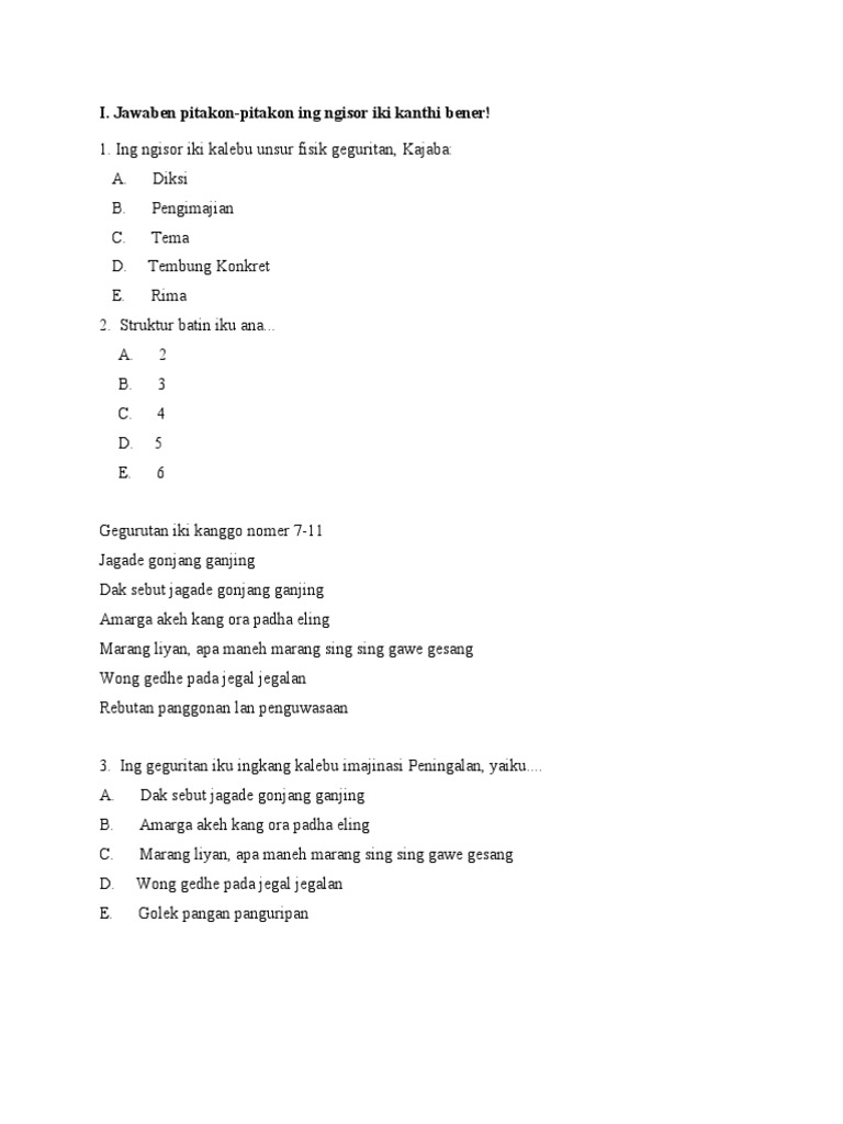 Yaiku tembung kang digunakake kanggo nyeritakake sawijining bab kanthi cara mbandingake karo bab liane. Materi geguritan sudah sangat sering kita temui, baik di smp, dikelas x, kelas xi, dan sekarang kita jumpai materi ini lagi di kelas xii. Geguritan ing bahasa indonesia kasebut namine puisi. Mulane antarane struktur lair lan struktur batin geguritan iku padha pentinge (wigatine). Kalebu struktur batin geguritan yaiku. Informasi undangan yang kami bagikan semoga menjadi informasi terbaik dan bisa benrmanfaat untuk semua khususnya informasi tentang contoh layang ganep terbaru 2020 yang semuanya kami kumpulkan. Sing ora kalebu struktur fisik guritan yaiku. Struktur lair teks geguritan : Struktur batin iki diwangun dening struktur lair mau. Yaiku gatraning geguritan kang tinulis mawa pada ing sawijiing geguritan. Struktur teks geguritan iku kaperang dadi loro, yaiku struktur lair lan struktur batin. Pamilihing tembung kang trep bisa ngasilake. Kalebu ing struktur batin geguritan yaiku.